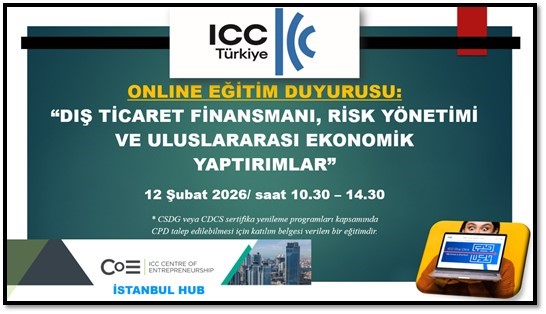 ICC Türkiye Milli Komitesi Bankacılık Komisyonu tarafından 12 Şubat 2026 tarihinde 10.30 – 14.30 saatleri arasında “Dış Ticaret Finansmanı, Risk Yönetimi ve Uluslararası Ekonomik Yaptırımlar” başlıklı bir online eğitim gerçekleştirilecektir.