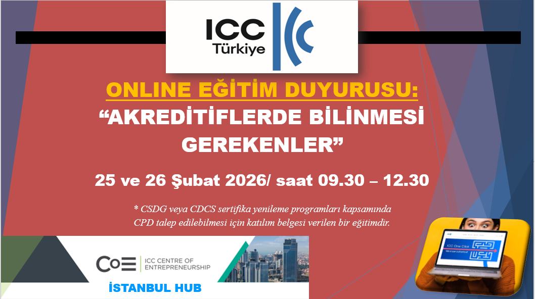 CC Türkiye Milli Komitesi Bankacılık Komisyonu ile ICC Girişimcilik Merkezi İstanbul Bölge Ofisi tarafından 25 ve 26 Şubat 2026 tarihlerinde 9.30 – 12.30 saatleri arasında “AKREDİTİFLERDE BİLİNMESİ GEREKENLER’’ başlıklı bir online eğitim gerçekleştirilecektir.