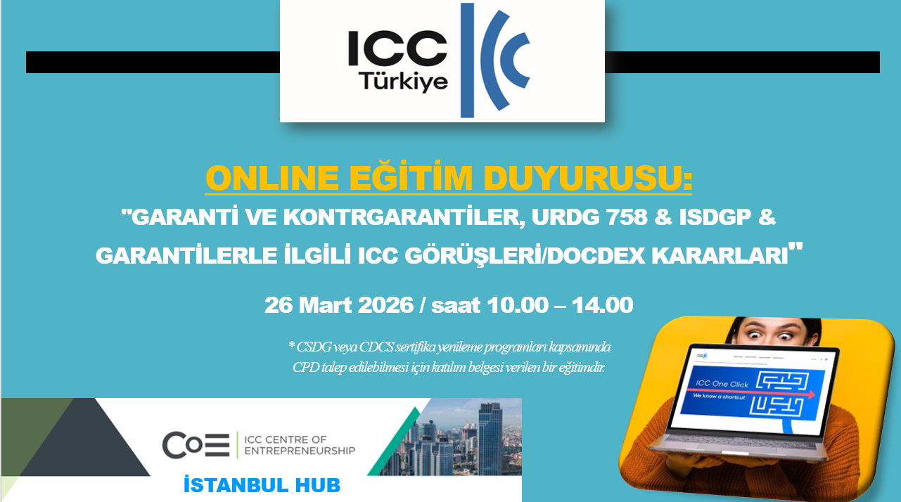 ICC Türkiye Milli Komitesi Bankacılık Komisyonu tarafından 26 Mart 2026 tarihinde 10.00 – 14.00 saatleri arasında “Garanti/ Kontrgarantiler, URDG758 & ISDGP & Garantilerle İlgili ICC Görüşleri ve Docdex Kararları” başlıklı bir online eğitim gerçekleştirilecektir.